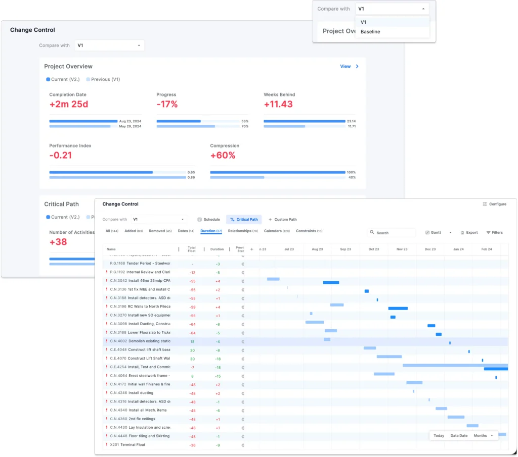 - It connects those changes to completion dates, progress, performance indexes, compression, and the critical path. This gives you a forensic view of how the plan is behaving across updates.