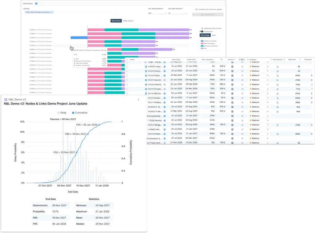 - Risk driver views let you select any activity or milestone and see which upstream activities and uncertainties are driving its risk position. This shows where intervention will have the most effect.