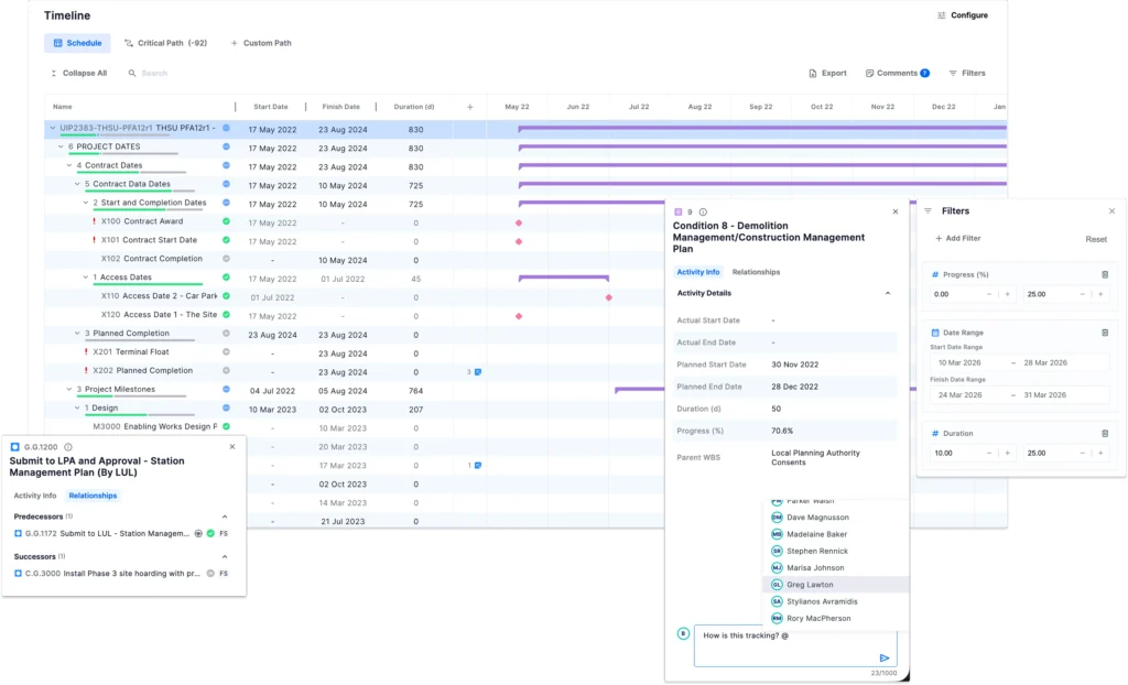 - Any stakeholder can click an activity, milestone, or WBS and add a comment. Mentions trigger notifications so questions, clarifications, and decisions reach the right people without extra meetings.